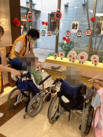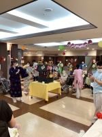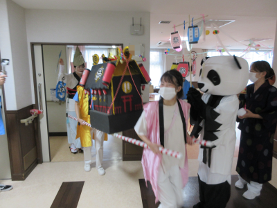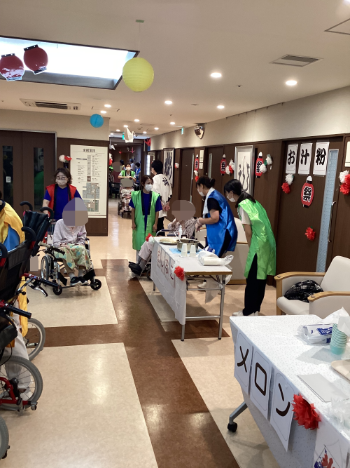 昨年は病棟毎のイベントとなりましたが、今年は1階フロアにて射的や金魚すくい、輪投げなどのゲーム。かき氷やチョコバナナ、お汁粉を用意させていただき、皆様楽しまれておりました。その他にも各病室にお神輿の練り歩きを行い、栄養科からは行事食を提供させて頂きました。